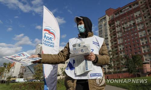 epa09469665 A man hands out brochures and newspapers of the United Russia party in Moscow, Russia, 15 September 2021. Elections of deputies of the State Duma, heads of 12 constituent entities of the Federation, and elections of deputies of legislative bodies of state power in 39 constituent entities of the Russian Federation, will take place on 19 September. However, according to the decision of the Central Election Commission, the elections will be held between 17 and 19 September 2021. EPA/YURI KOCHETKOV
