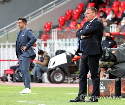 epa09469680 Spartak Moscow's head coach Rui Vitoria (L) and Legia Warsaw's coach Czeslaw Michniewicz (R) react during the UEFA Europa League group C soccer match between Legia Warsaw and FC Spartak Moscow at the Spartak Stadium in Moscow, Russia, 15 September 2021. EPA/MAXIM SHIPENKOV