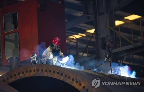 epa09470115 People work at a wind turbine at the Haili factory during an organized media tour in Rudong, Jiangsu province, China, 15 September 2021. Jiangsu Haili Wind Power Equipment Technology Co., Ltd, founded in August 2009, is a professional manufacturer of wind turbine tower and offshore wind turbine jacket platform. The company is located in Rudong, Jiangsu Province, Economic Development Zone, covers an area of 200 acres and includes factories more than 30000 square meters. EPA/ALEX PLAVEVSKI
