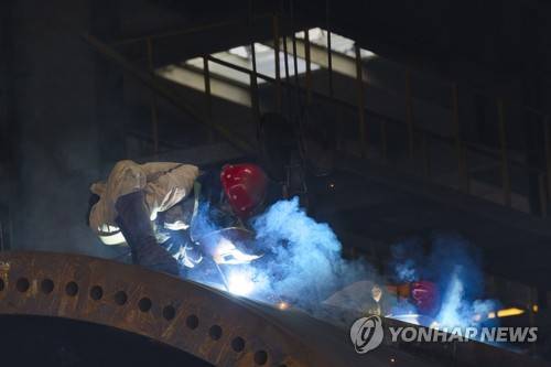 epa09470113 People work at a wind turbine at the Haili factory during an organized media tour in Rudong, Jiangsu province, China, 15 September 2021. Jiangsu Haili Wind Power Equipment Technology Co., Ltd, founded in August 2009, is a professional manufacturer of wind turbine tower and offshore wind turbine jacket platform. The company is located in Rudong, Jiangsu Province, Economic Development Zone, covers an area of 200 acres and includes factories more than 30000 square meters. EPA/ALEX PLAVEVSKI