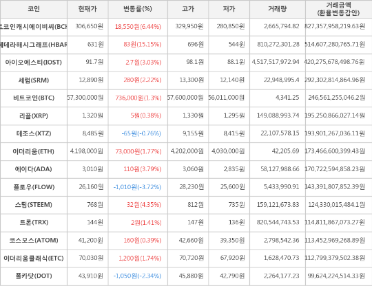 가상화폐 시세 (제공: 암호화폐 거래소 업비트)현재 암호화폐 거래소 "업비트"에 따르면 가상화폐 대장 격인 비트코인의 시세는 전일 대비 736,000원(1.3%) 상승한 57,300,000원에 거래되고 있다.