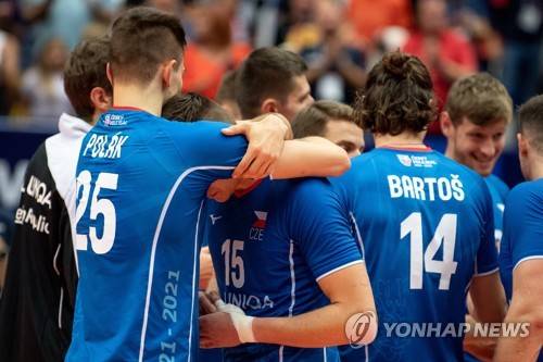 epa09470290 Josef Polak (L) and Lukas Vasina (R) of Czech Republic and teammates react after the men's EuroVolley 2021 quarterfinal match between Czech Republic and Slovenia in Ostrava, Czech Republic, 15 September 2021. EPA/LUKAS KABON