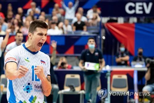 epa09470315 Saso Stalekar of Slovenia reacts during the men's EuroVolley 2021 quarterfinal match between Czech Republic and Slovenia in Ostrava, Czech Republic, 15 September 2021. EPA/LUKAS KABON
