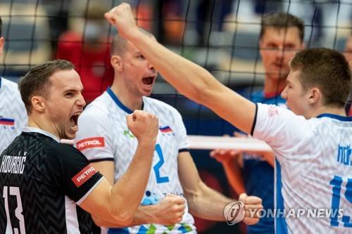 epa09470314 Jani Kovacic (L) of Slovenia reacts during the men's EuroVolley 2021 quarterfinal match between Czech Republic and Slovenia in Ostrava, Czech Republic, 15 September 2021. EPA/LUKAS KABON