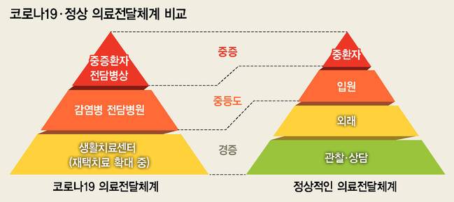 이와 관련해, 지난 1년8개월 동안 정부에 코로나19 의료 체계를 줄곧 조언해온 임승관 경기도의료원 안성병원장은 재택치료 확대를 넘어 ‘정상적인 1∼3차 피라미드형 의료 체계로의 복귀’를 준비할 때라고 제안했다. 지난 9일 경기도 수원시 인재개발원 사무실에서 <한겨레>와 만난 임 원장은 “코로나19는 1급 감염병으로 분류돼 높은 수준의 격리가 필요한 것으로 여겨져왔지만, 이제는 달라져야 한다”며 “코로나19와 공존(단계적 일상 회복)은 코로나19 확진자도 아플 때만 병원에 가도록 하는 의료 체계 개편과 함께 이뤄져야 한다”고 강조했다. 지금처럼 모든 환자를 확진과 동시에 시설에 격리·입원시키는 방식을 고집하면 병상은 늘 부족하고, 이 때문에 거리두기 단계를 올리는 일이 도돌이표처럼 반복될 수밖에 없기 때문이다. 집에서 머물다 아프면 외래 진료를 받고, 더 아프면 입원 치료를 받는 정상적인 의료 체계로 돌아가는 것은 코로나19 환자에게도 더 이롭다.