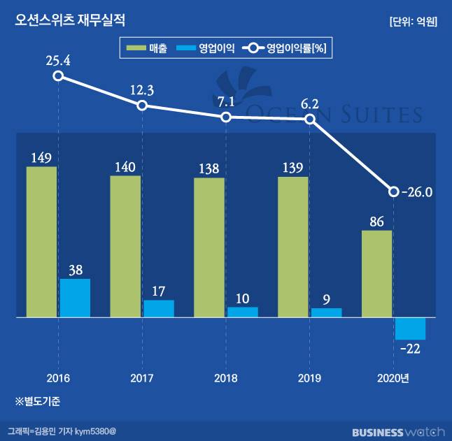 다만 요즘 오션스위츠의 경영성과는 신통치 못한 편이다. 김 대표 취임 당시 149억원에 이르던 매출은 이후 매년 예외없이 감소하며 작년에는 86억원에 머물렀다. 또한 영업손실 22억원으로 2010년 이후 10년만에 적자로 전환했다. 코로나19로 비롯된 호텔업의 침체가 오션스위츠호텔만 비켜가지는 않았다.