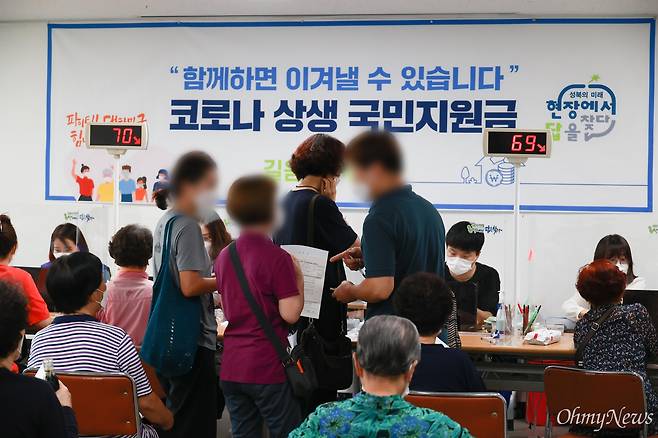 | ▲ '코로나 상생 국민지원금' 현장접수 첫날인 13일 오전 서울 성북구 길음1동 주민센터 3층에 마련된 접수창구에 많은 시민들이 방문하고 있다. |