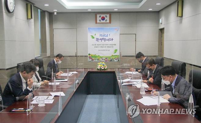(서울=연합뉴스) 이남우 국가보훈처 차장(왼쪽)이 지난 15일 코로나19 방역 대비 차 전북서부보훈지청을 방문해 업무보고를 받고 있다. 2021.9.16