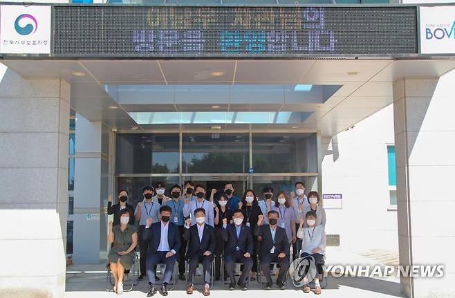 (서울=연합뉴스) 이남우 국가보훈처 차장(앞줄 왼쪽 세 번째)이 지난 15일 코로나19 방역 대비 차 전북서부보훈지청을 방문해 직원들과 기념 촬영을 하고 있다. 2021.9.16