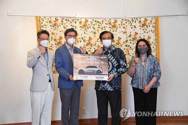 (서울=연합뉴스) 지난 15일 서울 영등포구 소재 주한 인도네시아 대사관에서 열린 아이오닉 5 전달식에서 현대차 김경수 상무(왼쪽부터)·김창범 자문역, 우마르 하디 대사, 젤다 울란 카티카 부대사가 기념 촬영을 하고 있다. 2021.9.16