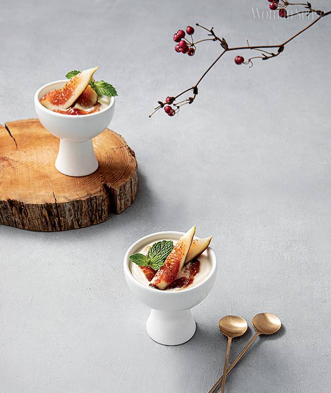 3 컵에 ②의 두부크림을 담은 뒤 먹기 좋게 썬 무화과와 민트를 얹어 낸다.