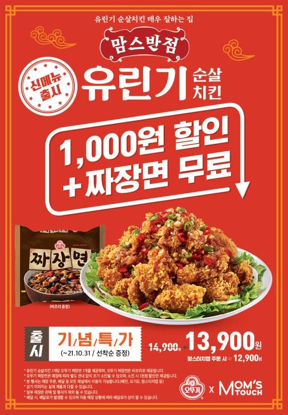 맘스터치는 이번 신메뉴 출시를 기념하는 맘스반점 이벤트를 매장, 배달 등 전 채널에서 진행한다. 다음달 말일까지 유린기 순살치킨 구입 시 1000원 할인된 1만3900원에 제공되며, 맘스터치 앱 주문 시에는 2000원 할인된 1만2900원의 할인 혜택이 적용된다. 또 유린기 순살치킨을 구매하는 모든 고객에게 오뚜기 '짜장면'(비조리 라면)을 선착순 무료 증정한다.