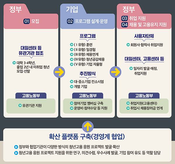 먼저 기업은 보유한 인적·물적자원을 활용해 기업별 특성에 맞는 청년역량 강화와 취업지원, 채용과정 투명성 강화 등의 프로그램을 추진하고, 동시에 정부는 모집과 채용 등 기업이 자체적으로 수행하기 어려운 부분을 지원한다.