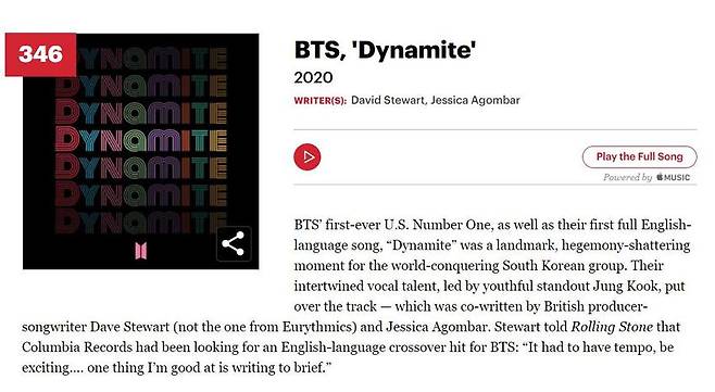 롤링스톤은 15일(현지시간) 이러한 내용의 역대 '베스트송 500'을 발표했는데, '다이너마이트'는 이 목록에서 346위로 선정됐습니다.