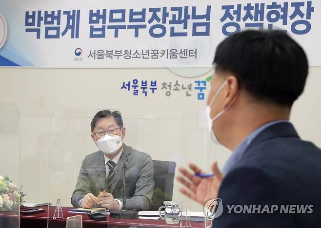 (서울=연합뉴스) 박범계 법무부 장관이 지난 15일 서울북부청소년비행예방센터를 방문해 업무현황을 청취하고 있다. 2021.9.16