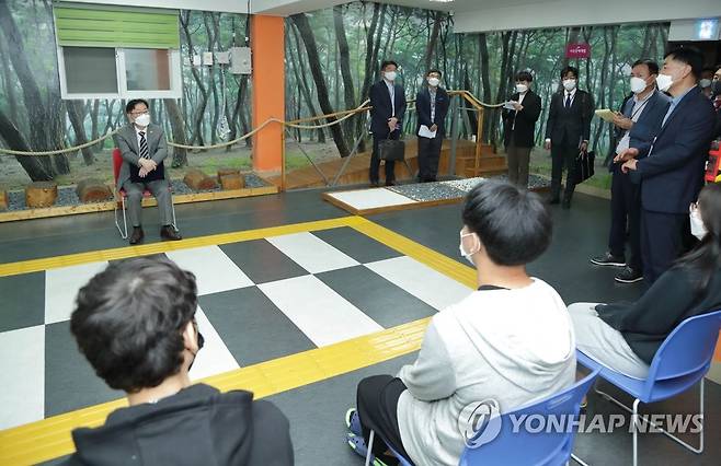 (서울=연합뉴스) 박범계 법무부 장관이 지난 15일 서울북부청소년비행예방센터를 방문해 청소년 비행예방교육 현장을 참관하고 있다. 2021.9.16