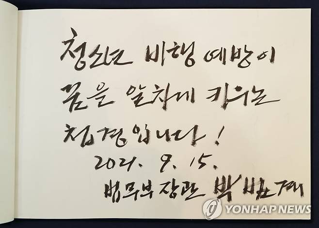 (서울=연합뉴스) 박범계 법무부 장관이 지난 15일 서울북부청소년비행예방센터를 방문해 작성한 방명록. 2021.9.16