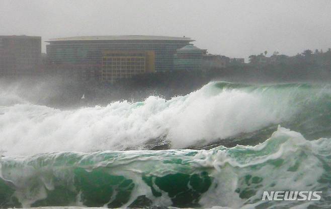 [서귀포=뉴시스] 우장호 기자 = 제14호 태풍 '찬투(CHANTHU)'가 북상 중인 16일 오전 제주 서귀포시 예래동 인근 해상에 집채만 한 파도가 몰아치고 있다. 기상청에 따르면 태풍이 지나는 동안 제주 지역에는 17일 오전까지 시간당 50~80㎜ 이상의 매우 강한 비가 쏟아질 것으로 예측됐다. 2021.09.16. woo1223@newsis.com