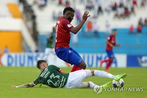 epa09470795 Jorge Benguche (C) of Olimpia disputes the ball against Mathias Techera (below) of Marathon during a match for the opening championship of the Honduran National League, between Marathon and Olimipa played at the Olympic Stadium in the city of San Pedro Sula in northern Honduras, 15 September 2021. EPA/Jose Valle