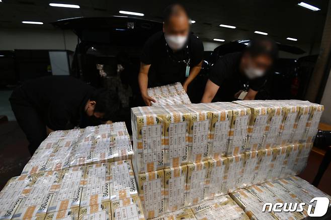 (서울=뉴스1) 사진공동취재단 = 16일 오전 서울 강남구 역삼동 한국은행 강남본부에서 관계자들이 시중 은행에 공급할 추석 자금을 방출하고 있다. 2021.9.16/뉴스1