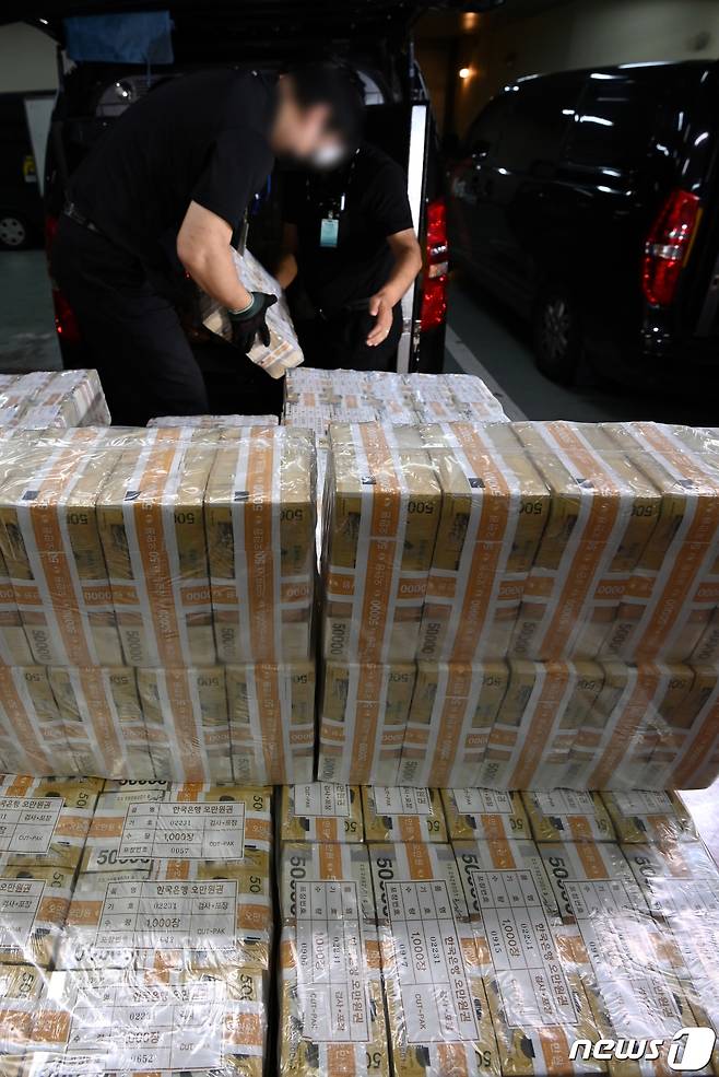 (서울=뉴스1) 사진공동취재단 = 16일 오전 서울 강남구 역삼동 한국은행 강남본부에서 관계자들이 시중 은행에 공급할 추석 자금을 방출하고 있다. 2021.9.16/뉴스1