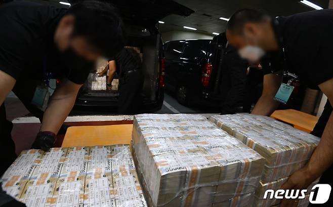 (서울=뉴스1) 사진공동취재단 = 16일 오전 서울 강남구 역삼동 한국은행 강남본부에서 관계자들이 시중 은행에 공급할 추석 자금을 방출하고 있다. 2021.9.16/뉴스1