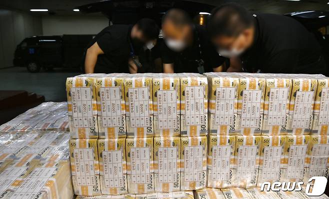 (서울=뉴스1) 사진공동취재단 = 16일 오전 서울 강남구 역삼동 한국은행 강남본부에서 관계자들이 시중 은행에 공급할 추석 자금을 방출하고 있다. 2021.9.16/뉴스1