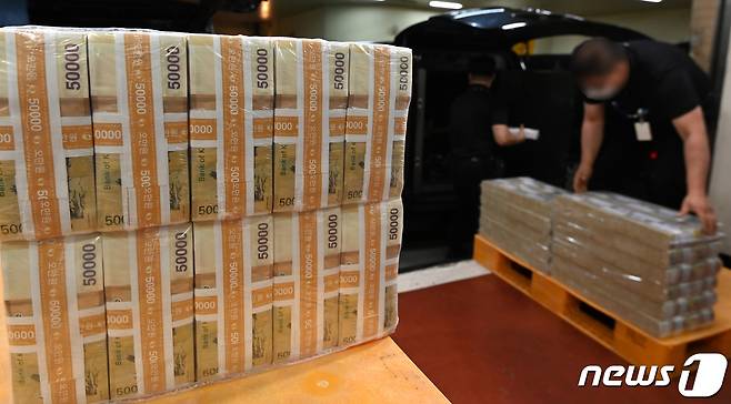(서울=뉴스1) 사진공동취재단 = 16일 오전 서울 강남구 역삼동 한국은행 강남본부에서 관계자들이 시중 은행에 공급할 추석 자금을 방출하고 있다. 2021.9.16/뉴스1