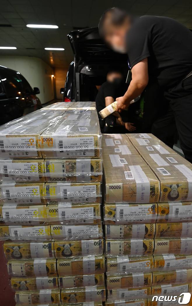(서울=뉴스1) 사진공동취재단 = 16일 오전 서울 강남구 역삼동 한국은행 강남본부에서 관계자들이 시중 은행에 공급할 추석 자금을 방출하고 있다. 2021.9.16/뉴스1