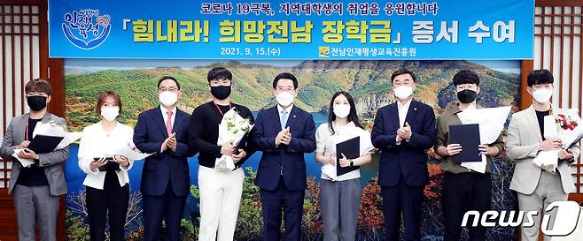 (무안=뉴스1) 전원 기자 = 김영록 전라남도지사가 15일 오전 도청 접견실에서 열린 ‘힘내라! 희망전남 장학금’ 증서 수여식에서 최일 동신대 총장(왼쪽 일곱번째), 고석규 전남인재평생교육진흥원장(왼쪽 세번째)을 비롯해 학생들과 기념촬영을 하고 있다.(전남도 제공) 2021.9.16/뉴스1