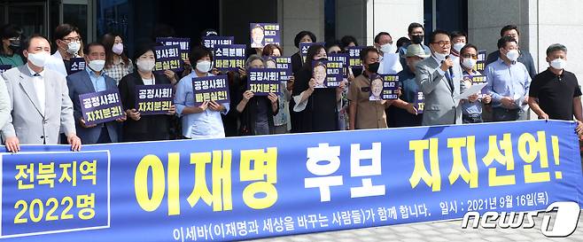 (전주=뉴스1) 유경석 기자 = 전북지역 권리당원 및 시민 등 2022명 일동이 16일 전북 전주시 전북도청 앞에서 이재명 민주당 대선 경선 후보 지지선언을 하고 있다. 2021.9.16/뉴스1