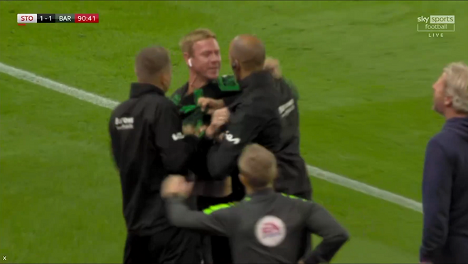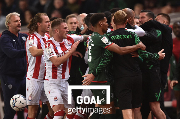 예상치 못한 양 팀 벤치의 충돌로 경기는 약 5분여간 중단됐고 간신히 경기장 경호원들까지 투입되어 상황은 진정됐다. 주심은 정리된 후 난투극에 가담했던 코치진들에게 다이렉트 퇴장을 선언했다. 스토크 시티는 홀든 코치와 로리 델랍 코치가 퇴장 명령을 받았고, 반즐리는 조셉 라우만 코치가 퇴장 조치로 경기장을 빠져나갔다.