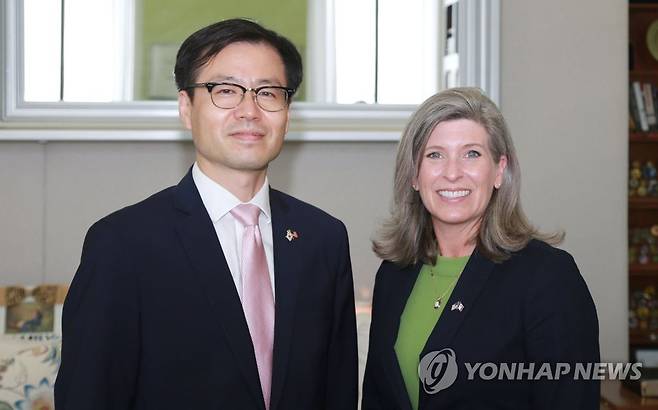(서울=연합뉴스) 여한구 산업통상자원부 통상교섭본부장이 15일(현지시간) 워싱턴DC에서 조니 언스트 상원의원과 기념촬영을 하고 있다. 2021.9.16