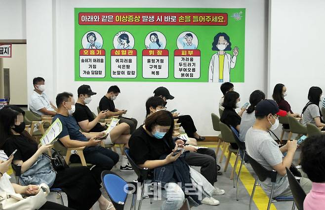 [이데일리 김태형 기자] 16일 오전 서울 영등포구 영등포아트홀에 마련된 코로나19 백신접종센터에서 접종을 마친 시민들이 모니터링실에서 대기하고 있다.
