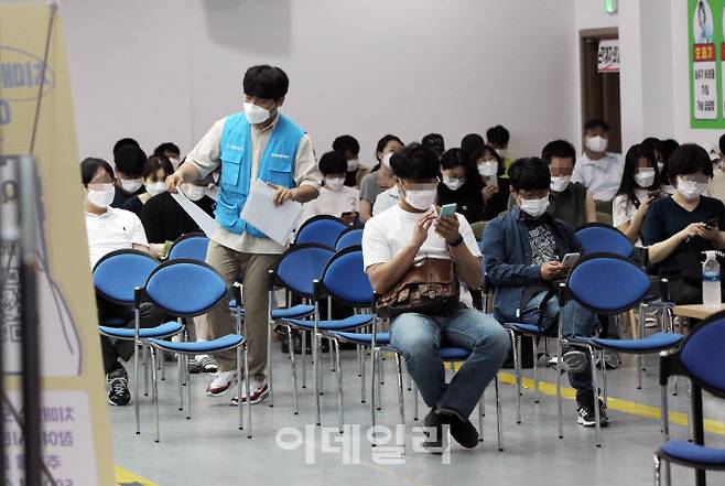 [이데일리 김태형 기자] 16일 오전 서울 영등포구 영등포아트홀에 마련된 코로나19 백신접종센터에서 접종을 마친 시민들이 모니터링실에서 대기하고 있다.