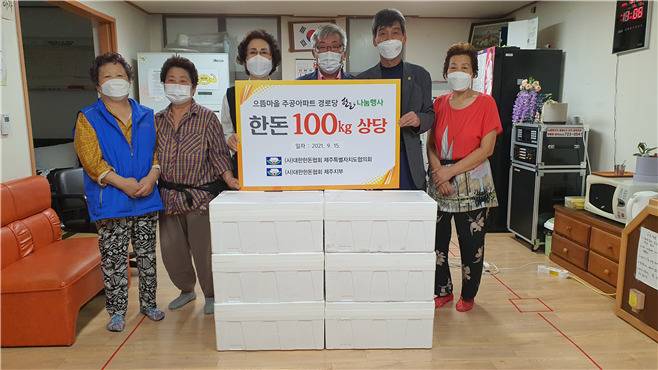 대한한돈협회 제주특별자치도협의회(회장 김재우)는 추석명절을 앞두고 제주시 으뜸마을 주공아파트 경로당(회장 천정심)에 제주산 돼지고기 100kg을 전달했다고 16일 밝혔다.