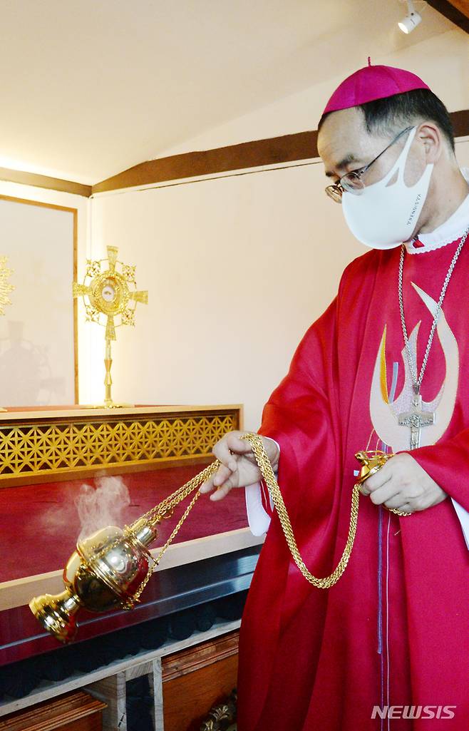 [완주=뉴시스] 김얼 기자 = 천주교 전주교구장 김선태 사도 요한 주교가 16일 전북 완주군 초남이성지 유해 안치소에서 '한국 최초의 순교자 복자 윤지충 바오로와 권상연 야고보, 신유박해 순교자 복자 윤지헌 프란치스코 현양 미사 및 유해 안치식'을 열고 안치식을 거행하고 있다. 2021.09.16. pmkeul@newsis.com