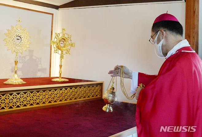 [완주=뉴시스] 김얼 기자 = 천주교 전주교구장 김선태 사도 요한 주교가 16일 전북 완주군 초남이성지 유해 안치소에서 '한국 최초의 순교자 복자 윤지충 바오로와 권상연 야고보, 신유박해 순교자 복자 윤지헌 프란치스코 현양 미사 및 유해 안치식'을 열고 안치식을 거행하고 있다. 2021.09.16. pmkeul@newsis.com