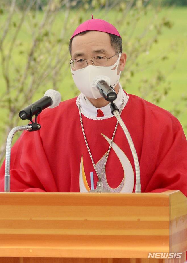 [완주=뉴시스] 김얼 기자 = 천주교 전주교구장 김선태 사도 요한 주교가 16일 전북 완주군 초남이성지 유해 안치소 마당에서 '한국 최초의 순교자 복자 윤지충 바오로와 권상연 야고보, 신유박해 순교자 복자 윤지헌 프란치스코 현양 미사 및 유해 안치식'에 참석해 미사를 드리고 있다. 2021.09.16. pmkeul@newsis.com