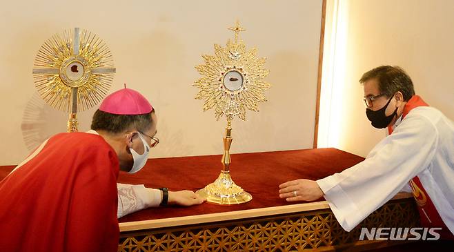 [완주=뉴시스] 김얼 기자 = '한국 최초의 순교자 복자 윤지충 바오로와 권상연 야고보, 신유박해 순교자 복자 윤지헌 프란치스코 현양 미사 및 유해 안치식'이 열린 16일 전북 완주군 초남이성지 유해 안치소에서 천주교 전주교구장 김선태 사도 요한 주교를 비롯한 관계자가 장내를 정돈하고 있다. 2021.09.16. pmkeul@newsis.com