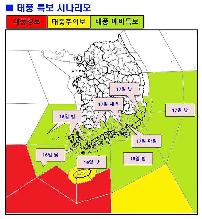 기상청은 16일 낮부터 제주와 전남 해안부터 태풍주의보를 발표하기 시작해 17일 낮까지 영·호남 남해안 지역에 태풍주의보를 잇따라 발령할 예정이다.