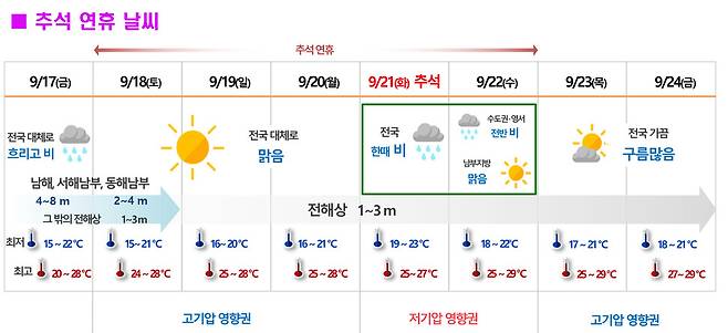 기상청은 16일 "추석날인 21일 북쪽을 지나는 저기압의 영향으로 한랭전선상에서 발달한 비구름대가 통과하면서 전국에 비가 내리겠다"고 예보했다.