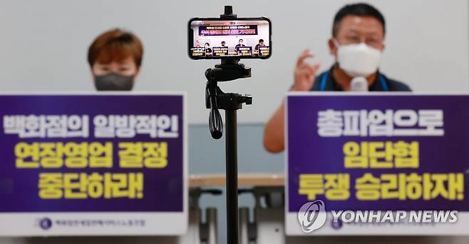 (서울=연합뉴스) 홍해인 기자 = 백화점면세점판매서비스노조 관계자들이 16일 서울 서대문구 서비스연맹 회의실에서 추석 연휴기간 백화점·면세점·쇼핑몰 화장품 판매노동자 총파업 돌입 선포 기자회견을 하고 있다.