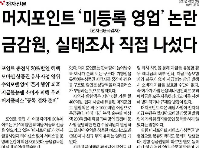 △전자신문 경제금융증권부 이형두 기자 <머지포인트 ‘미등록 영업’ 논란...금감원 실태조사 직접 나섰다 外>