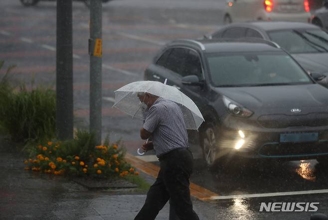 [서귀포=뉴시스] 우장호 기자 = 제14호 태풍 '찬투(CHANTHU)'가 북상 중인 16일 오후 제주 서귀포시 서홍동 인근 거리에서 시민들이 비바람을 피해 이동하고 있다. 찬투가 접근함에 따라 제주 지역엔 태풍주의보가 내려졌다. 기상청은 제주도에 강풍과 함께 최대 400mm의 많은 비가 내리겠다고 예보했다. 2021.09.16. woo1223@newsis.com
