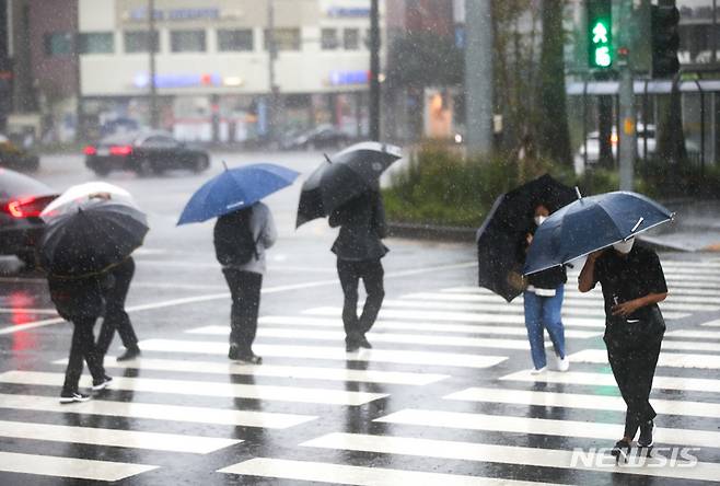 [서귀포=뉴시스] 우장호 기자 = 제14호 태풍 '찬투(CHANTHU)'가 북상 중인 16일 오후 제주 서귀포시 서홍동 인근 거리에서 시민들이 비바람을 피해 이동하고 있다. 찬투가 접근함에 따라 제주 지역엔 태풍주의보가 내려졌다. 기상청은 제주도에 강풍과 함께 최대 400mm의 많은 비가 내리겠다고 예보했다. 2021.09.16. woo1223@newsis.com