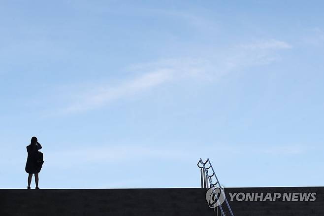 (서울=연합뉴스) 강민지 기자 = 비교적 맑은 날씨를 보인 16일 오전 시민이 서울 용산구 국립중앙박물관에서 하늘 사진을 찍고 있다. 2021.9.16