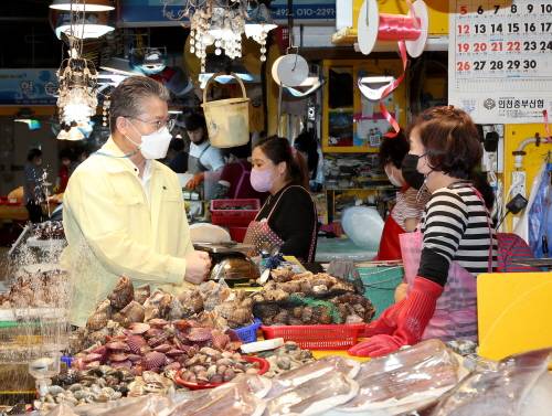 이날 방문은 코로나19 확산세를 감안해 추석 명절 대비 전통시장 방역상태 점검 및 사회적 거리두기 등 방역수칙 준수로 인해 어려움을 겪고 있는 상인들에게 따뜻한 격려와 위로를 전하고 다양한 의견을 청취하기 위해 진행됐다.