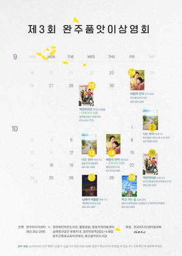 9월 29일 삼례 '액션히어로'와 10월 14일 이서 '바람의 언덕' 상영회는 영화를 만든 이진호 감독과 박석영 감독을 초청해 대화하는 시간을 갖고 10월 2일 소양 상영회는 카페 소리나무에 야외상영으로 진행된다.