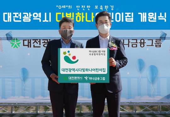 하나금융그룹은 ‘0세 영아 전용’ 국공립어린이집인 ‘다빛하나어린이집’ 개원식을 했다고 16일 밝혔다. 지난 15일 오후 대전시 서구 갈마동에서 진행된 개원식에는 함영주(사진 왼쪽) 하나금융그룹 부회장과 허태정(〃 오른쪽) 대전시장 등 관계자들이 참석했다. 다빛하나어린이집은 2018년 5월부터 저출산 문제 극복 및 일·가정 양립을 위해 하나금융에서 추진하고 있는 ‘100호 어린이집 건립 프로젝트’ 일환으로 지어졌다. 이 프로젝트는 보육 시설 취약 지역 위주로 90곳의 국공립어린이집을 건립하고, 상생형 공동직장어린이집을 포함한 직장어린이집 10곳을 설립·운영하는 하나금융의 대표적 환경·사회·지배구조(ESG) 경영활동이다. 다빛하나어린이집은 교사 1명이 만 0세아 3명과 만 1세아 5명을 보육하는 일반 어린이집과 달리, 교사 1명이 0세아 2명과 1세아 3명을 전담해 영아에 필요한 세심한 보육 서비스가 가능하다.